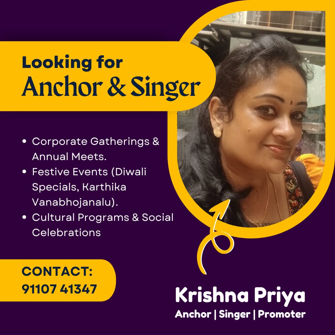Krishna Priya is a dynamic entertainer who brings energy, charm, and elegance to every stage. With her versatile talent in anchoring, singing, and promotions, she captivates audiences and makes every event memorable. From corporate gatherings, weddings, and cultural programs to brand promotions and musical nights, Krishna Priya ensures a lively and engaging experience. Her strong stage presence, melodious voice, and professional approach make her the perfect choice to elevate your events with style and impact.