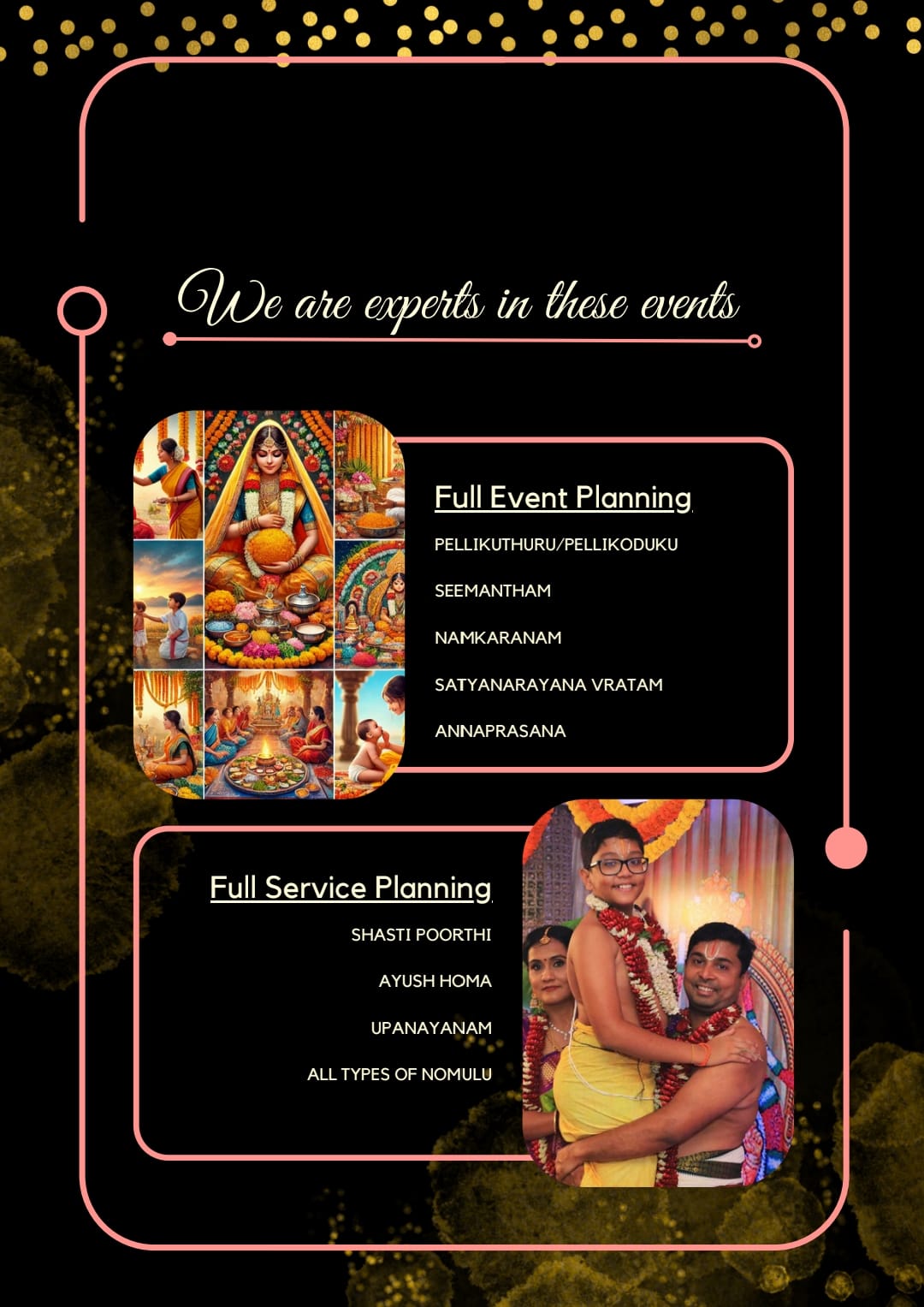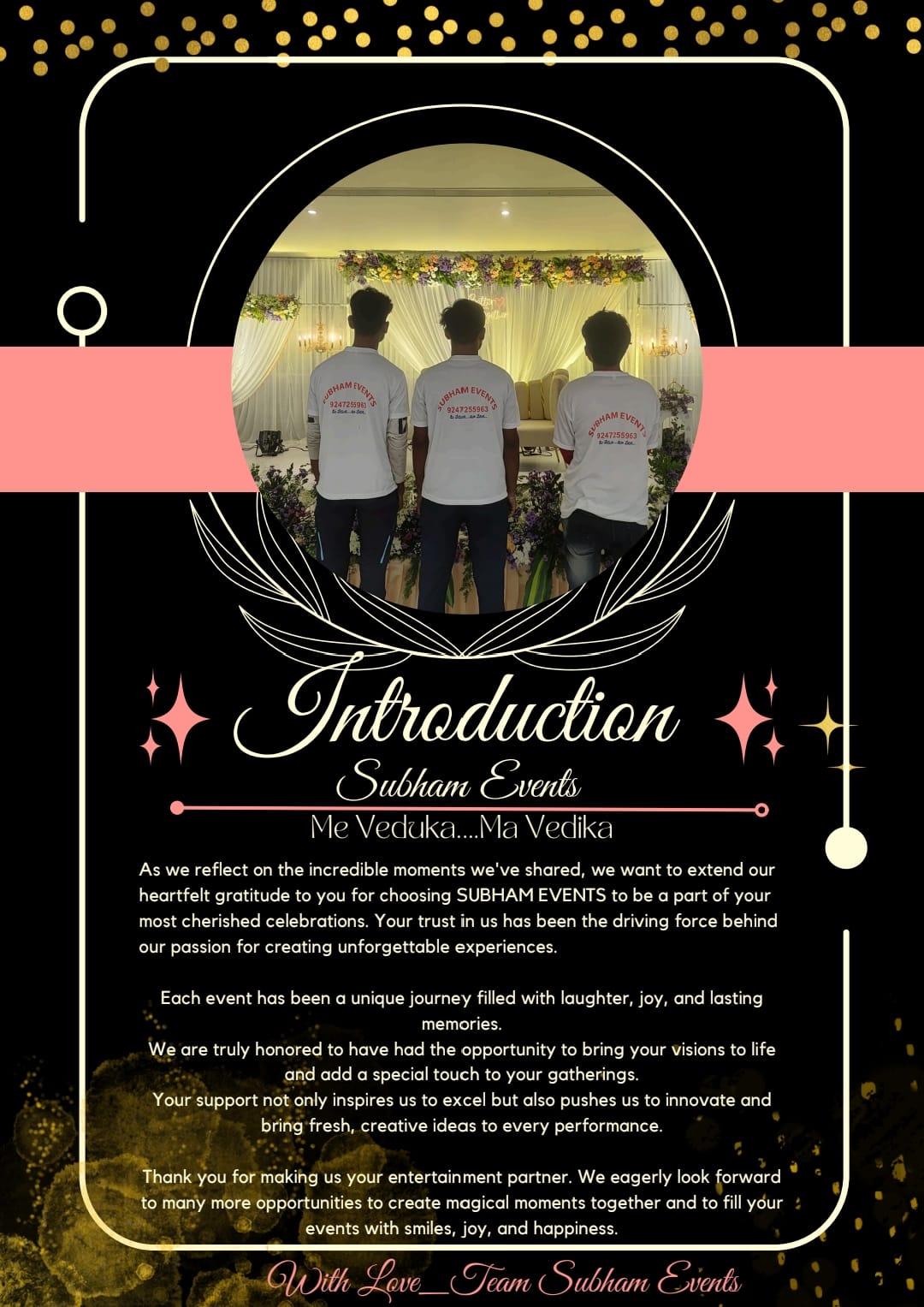 As we reflect on the incredible moments we've shared, we want to extend our heartfelt gratitude to you for choosing SUBHAM EVENTS to be a part of your most cherished celebrations. Your trust in us has been the driving force behind our passion for creating unforgettable experiences.